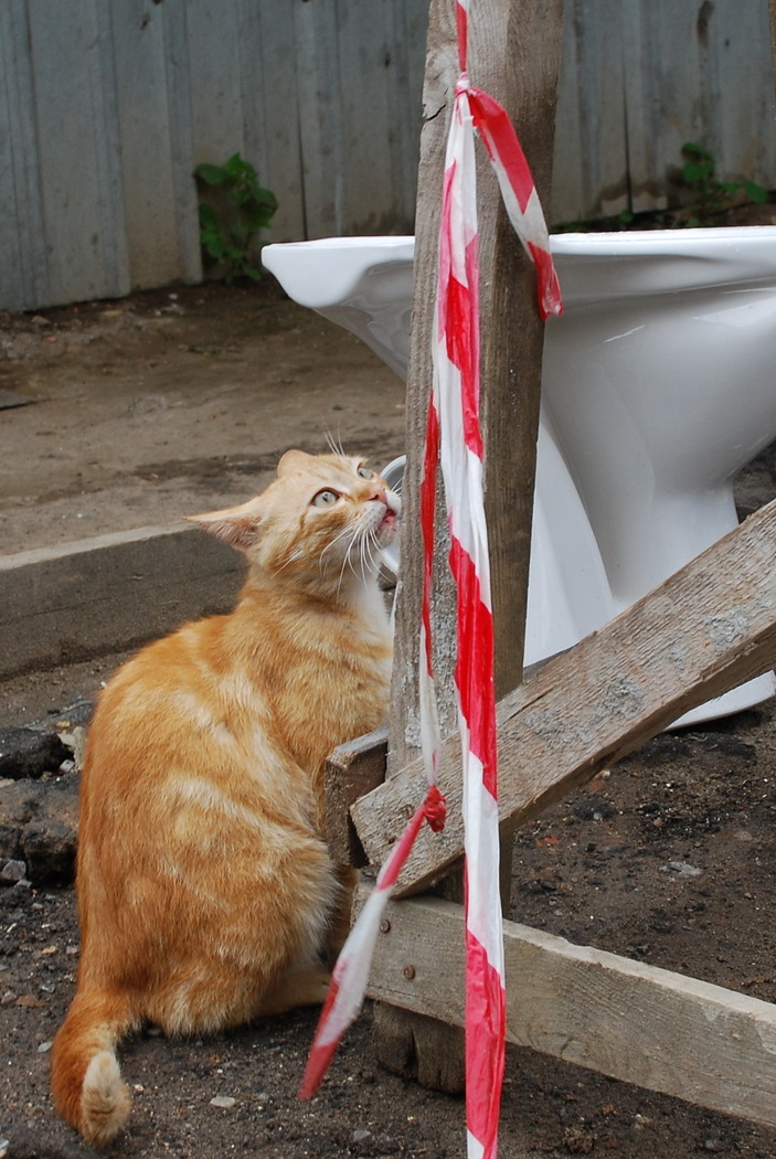 Кіт-Воркіт біля воріт, чеше лапкою живіт